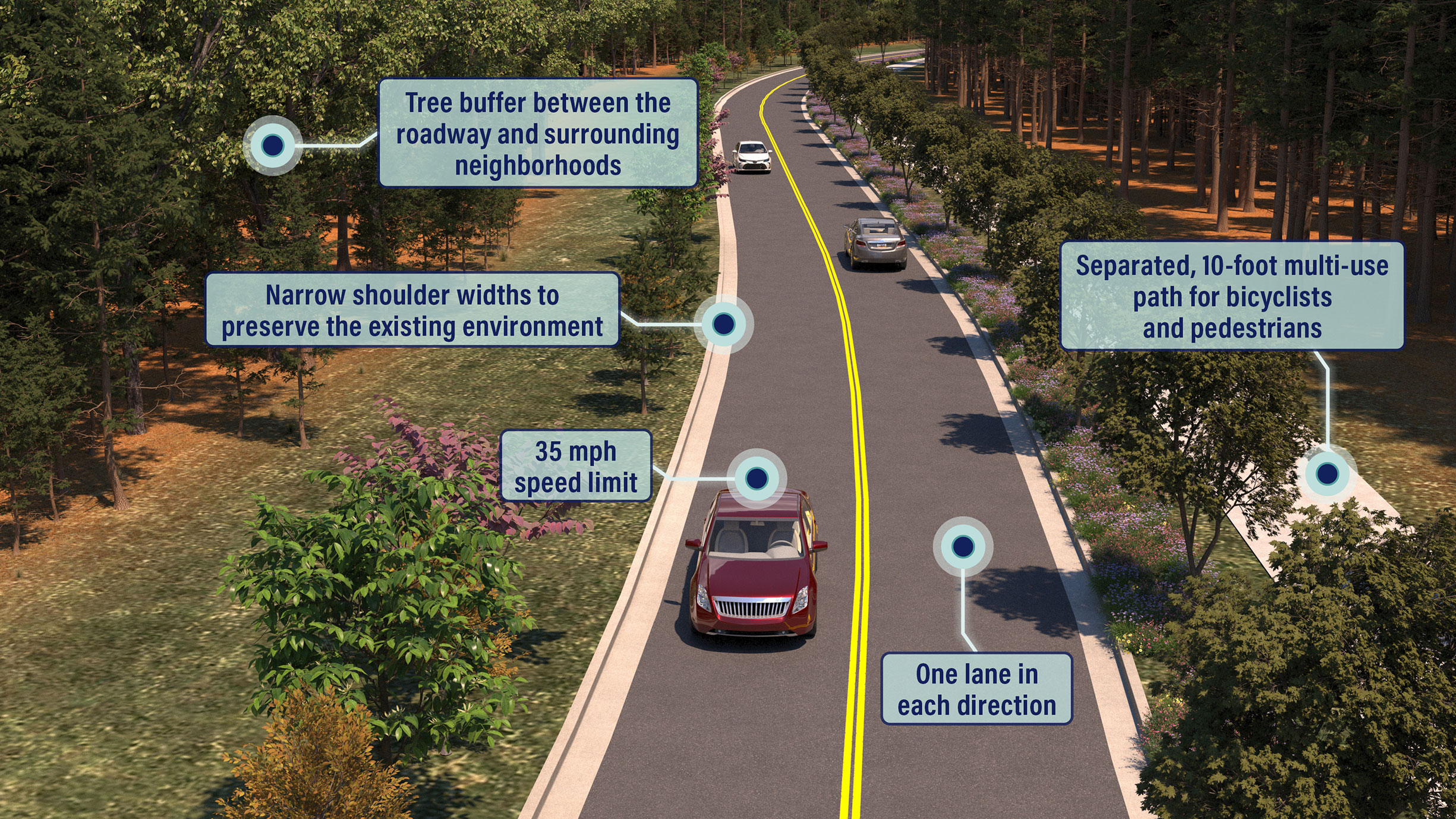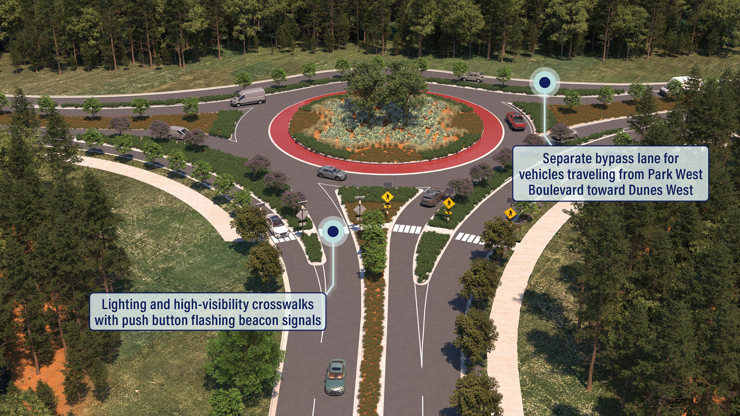 - Upgrades to the Park West Boulevard roundabout, including a separate bypass lane for vehicles traveling from Park West Boulevard toward Dunes West, lighting, and high-visibility crosswalks
