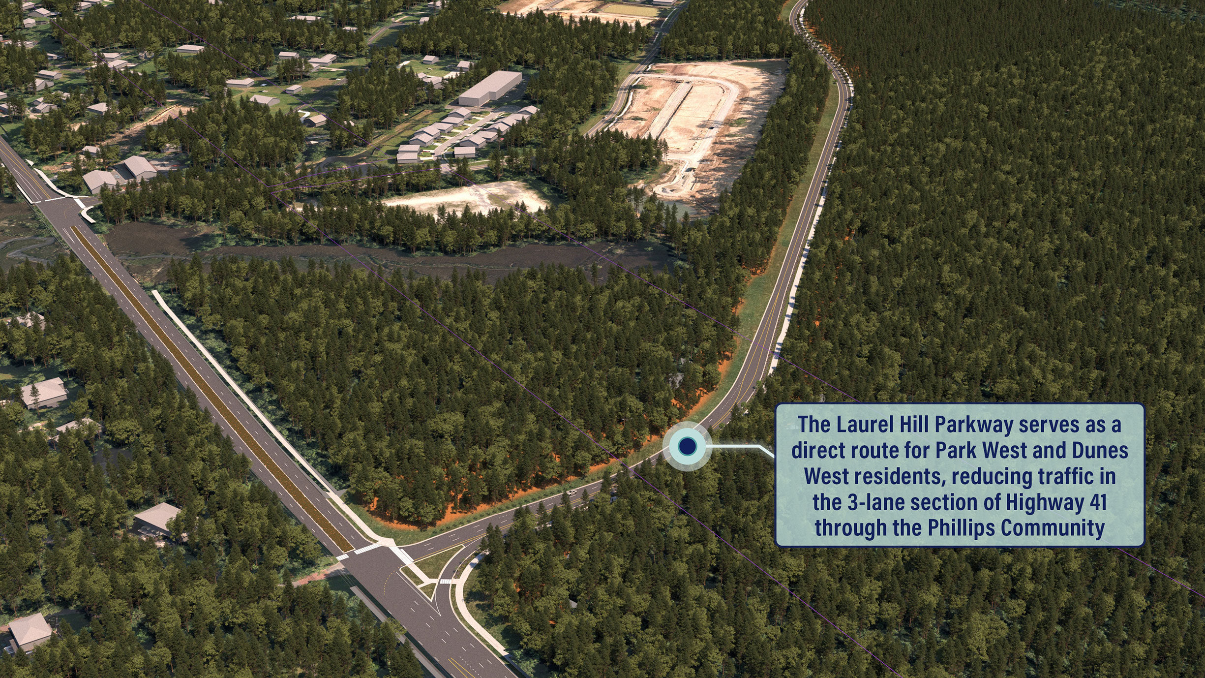 Included with the Highway 41 Corridor Improvements project 4-3-4 design is the Laurel Hill Parkway, a new, two-lane connection road to Park West Boulevard. This connection is a critical piece of the Highway 41 Corridor Improvements project, and it is what will make the entire roadway network work efficiently.